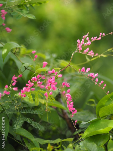 Pink flower Coral Vine, MePink flower Coral Vine, Mexican Creeper, Chain of Love Antigonon leptopus Hook and Arn name beautiful little bouquet blurred of nature background