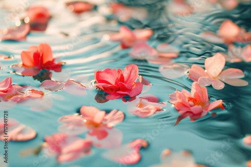 Pink flower petals in pool water. Background image. Created with Generative AI technology