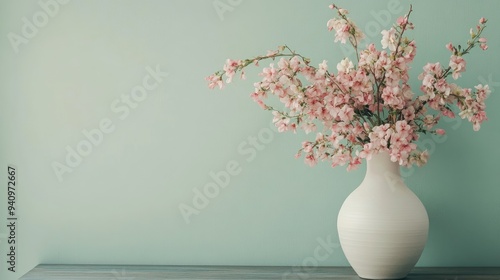Pink flowers in a simple white vase against pastel green walls, on a table, evoking a calm and refreshing atmosphere.
