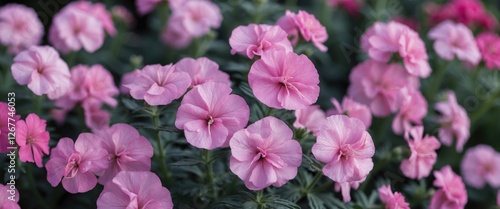 Pink flowers in full bloom with lush green foliage in a garden setting with ample space for text Copy Space