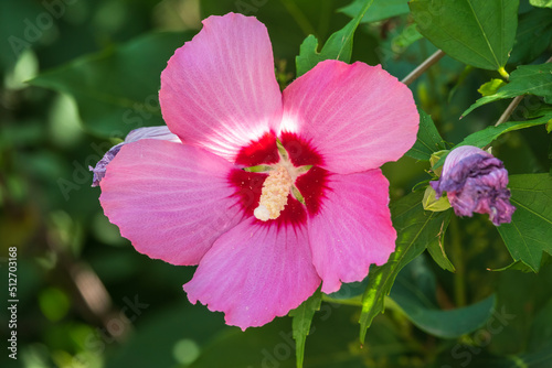 Pink flowers of Hibiscus moscheutos plant close-up. Hibiscus moscheutos, swamp hibiscus,