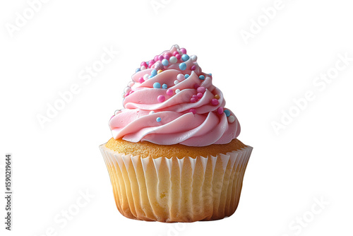 Pink frosted cupcake with sprinkles. Isolated on transparent background, png