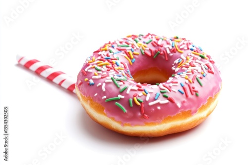 Pink Frosted Donut with Colorful Sprinkles and Candy Cane Isolated