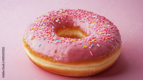 Pink frosted donut with colorful sprinkles on a soft pastel pink background delicious dessert concept with sweet treat appeal