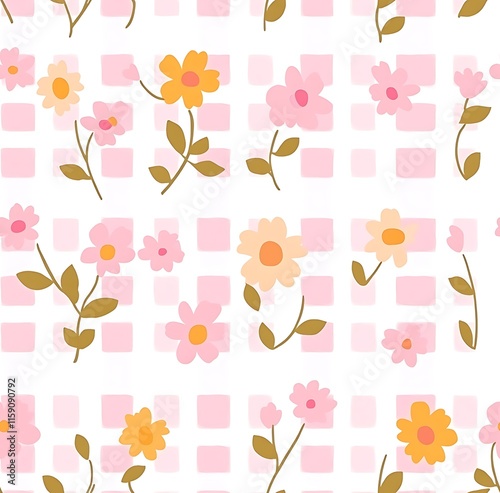 Pink gingham seamless pattern with small pink flowers, easter seamless pattern