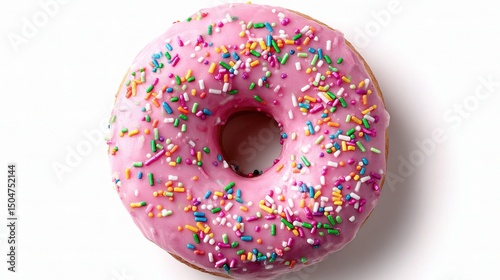 Pink Glazed Donut with Rainbow Sprinkles Top View on White Background