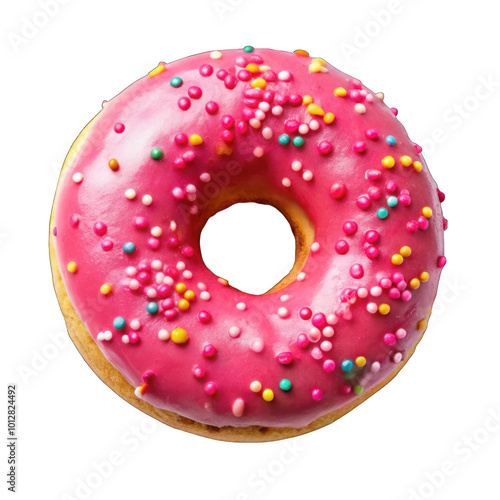 Pink glazed donut with sprinkles top view isolated on transparent background