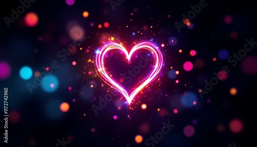 Pink glow neon light heart line drawing with pink bokeh light on dark background, Valentine Day concept