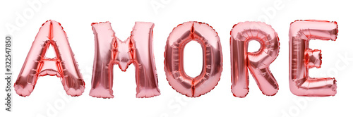 Pink golden word AMORE made of inflatable balloons isolated on white background. Rose gold foil balloon letters, concept of love, romance, Valentine's Day.