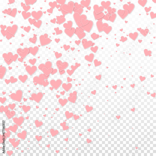 Pink heart love confettis. Valentine's day gradient unique background. Falling stitched paper hearts confetti on transparent background. Cute vector illustration.