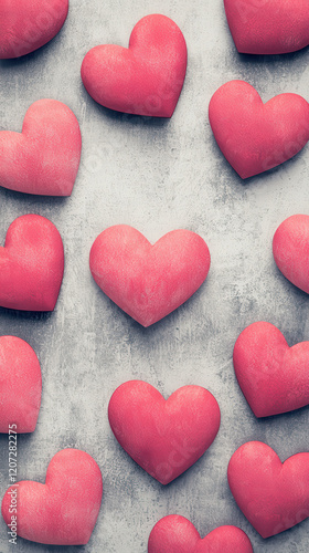 Pink heart shaped objects arranged on textured gray background, creating romantic and artistic pattern