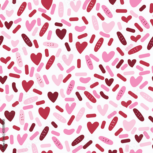 Pink hearts cute seamless pattern. Colorful doodle hearts on a white background. Ready template for design, postcard, print, poster, party, Valentine's Day