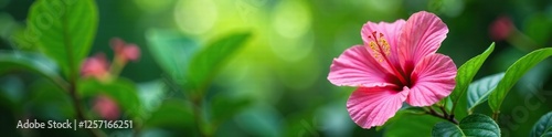 Pink hibiscus blooms amidst lush greenery in a tropical garden, pink flowers, serenity