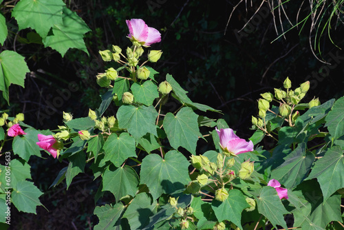 Pink hibiscus (Hibiscus indicus) with flowers and buds on sunny autumn day, Montenegro