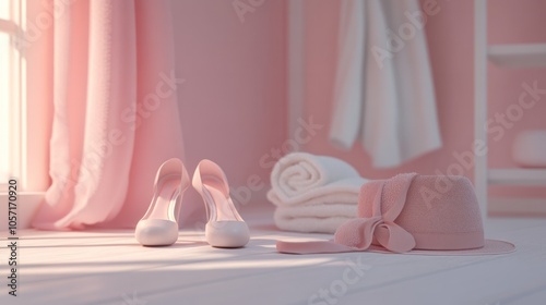 Pink High heels, pink dress, pink hat, a belt, and a pink towel, everything is pink.