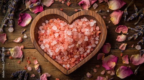 Pink Himalayan salt in heart-shaped bowl with rose and lavender petals.
