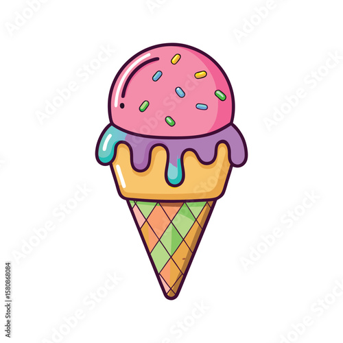 Pink ice cream cone with melting purple topping and sprinkles vector
