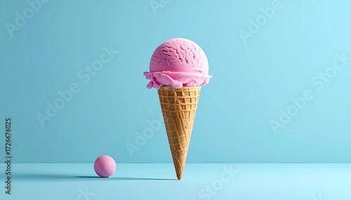 Pink ice cream scoop in waffle cone, pastel background