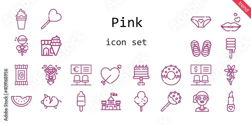 pink icon set. line icon style. pink related icons such as cotton candy, castle, panties, piggy bank, candy, bouquet, lollipop, lipstick, girl, kiss, popsicle, flower, cake pop, cupid, bank