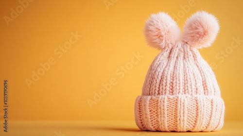 Pink Knitted Hat with Fur Pom-Poms on a Yellow Background