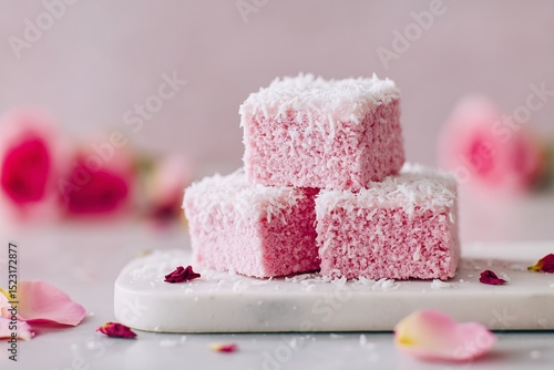 Pink Lamingtons with Beetroot or Raspberry Sponge on Marble with Rose Petals