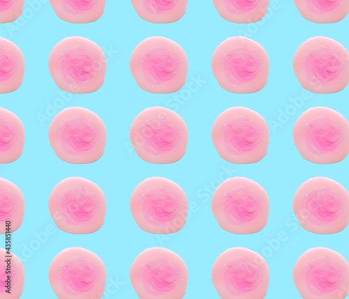 Pink liquid soap isolated on blue color. Abstraction of pink spots. Beautiful blots. Pattern