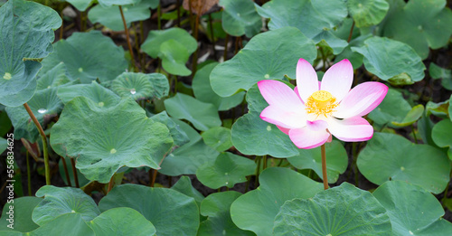 Pink lotus flower blooming in pond with green leaves