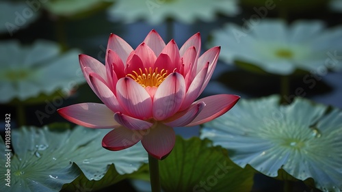 Pink Lotus Flower Blooms Among Green Lily Pads