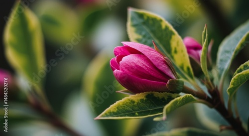 Pink Magnolia Bud Closeup with Variegated Leaves