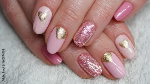 Pink manicure with gold heart and glitter nail art design ideas trend