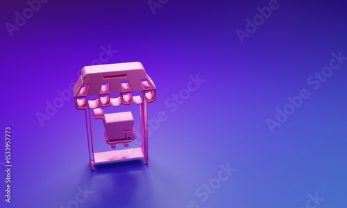 Pink Mobile phone and shopping cart with striped awning icon isolated on purple-blue background. Online buying symbol. Supermarket basket symbol. Minimalism concept. 3D render illustration