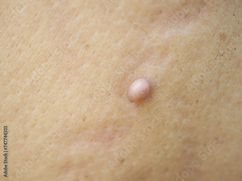 Pink mole, pink birthmark on back of woman. Closeup photo, blurred.