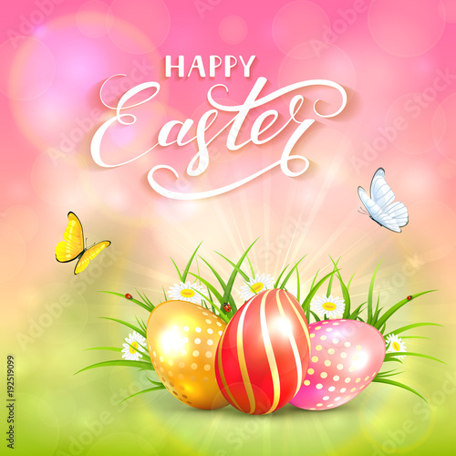 Pink nature sunny background with Easter eggs