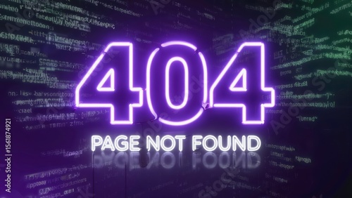 pink Neon "404 Page Not Found" sign glowing against a digital code background. Modern cyberpunk style error screen representing a broken or missing web page.