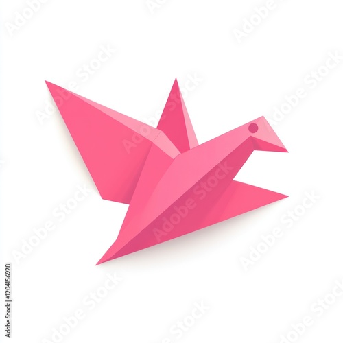 Pink origami bird in flight on white background, for children's book illustration or greeting card