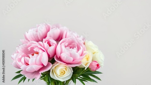 Pink peonies and white garden roses arranged in a lush, full bouquet against a pale gray background, large flowers, floral arrangement