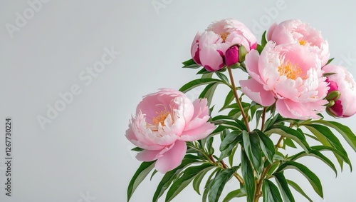 Pink peony flowers bouquet with green leaves on light background with Copy Space
