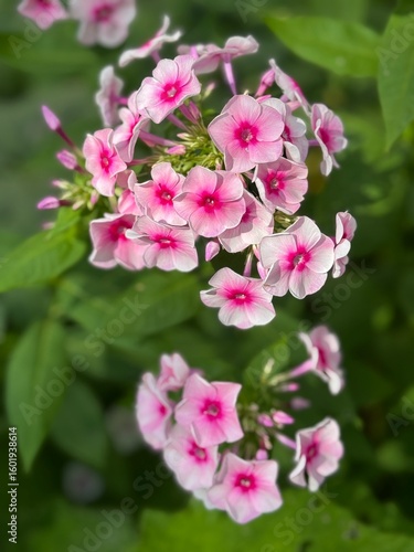 Pink Phlox paniculata flowers in full bloom. Closeup of delicate summer blossoms with soft pink petals and green leaves. Ideal for garden, floral, and nature themes