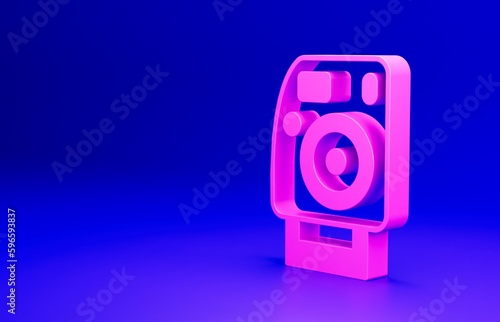 Pink Photo camera icon isolated on blue background. Foto camera. Digital photography. Minimalism concept. 3D render illustration