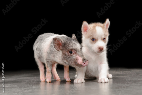pink pig and husky puppy standing next to the floor in the Studio on a black background