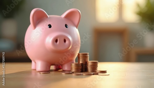 Pink piggy bank next stack of pennies. Coins piles stand on wooden table. Concept of finance, savings, investment, money box. Financial planning, wealth, banking, saving concept. Economic success,