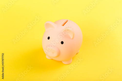 pink piggy bank on a yellow background. Concept of saving money or savings, investment.