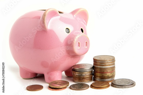 Pink piggy bank with coin stacks on white background