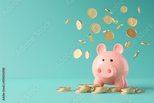 Pink piggy bank with falling gold coins on turquoise background, illustrating concept of savings, investment, and financial growth.