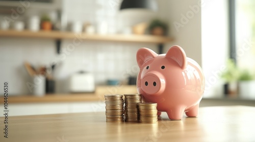 Pink piggy bank with stacked coins on a table set against a bright kitchen interior highlighting the concept of saving budgeting and financial planning