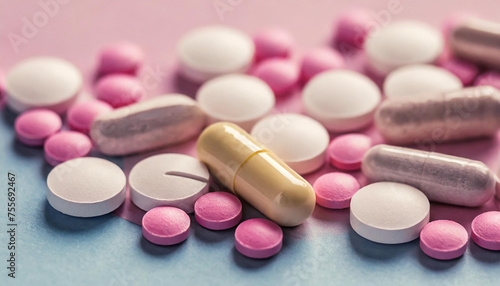 Pink pills and capsule on pastel background. Pharmaceutical vitamin or drug. Medical care and treatment.
