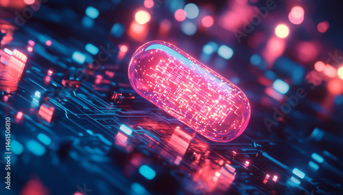 Pink pills with circuit patterns floating on electronic boards represent the role of technology in healthcare