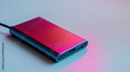 Pink power bank charging with cable on white surface with pink and blue neon light