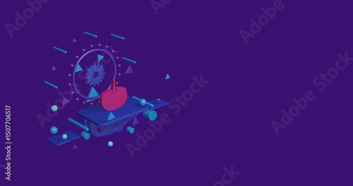 Pink pumpkin symbol on a pedestal of abstract geometric shapes floating in the air. Abstract concept art with flying shapes on the left. 3d illustration on deep purple background