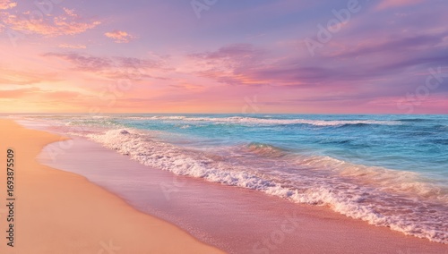 Pink Purple Sunset Over Calm Ocean Beach with Gentle Waves and Sandy Shore